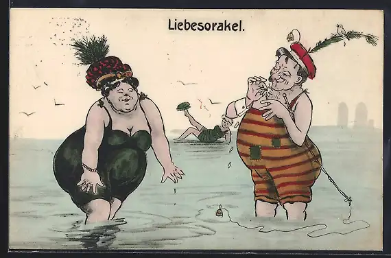 Künstler-AK Beleibte Frau im Badeanzug, Mann mit Angel