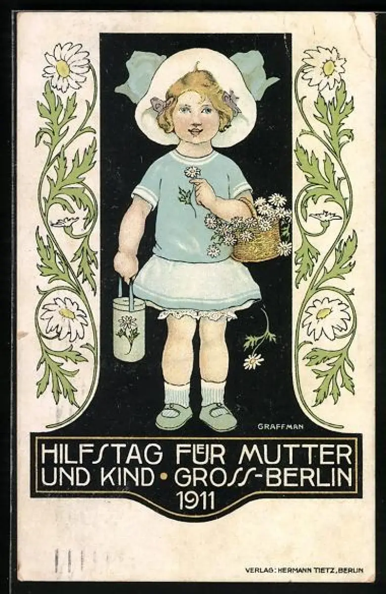 Künstler-AK Berlin, Hilfstag für Mutter und Kind 1911, Mädchen mit eine Korb voller Margeriten