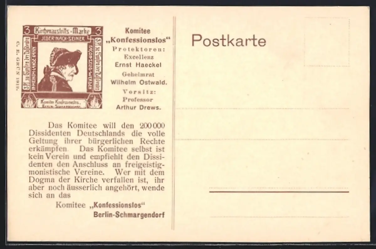 Künstler-AK Berlin-Schmargendorf, Kirchenaustritts-Marke, Komitee Konfessionslos, Excellenz Ernst Haeckel, Religion