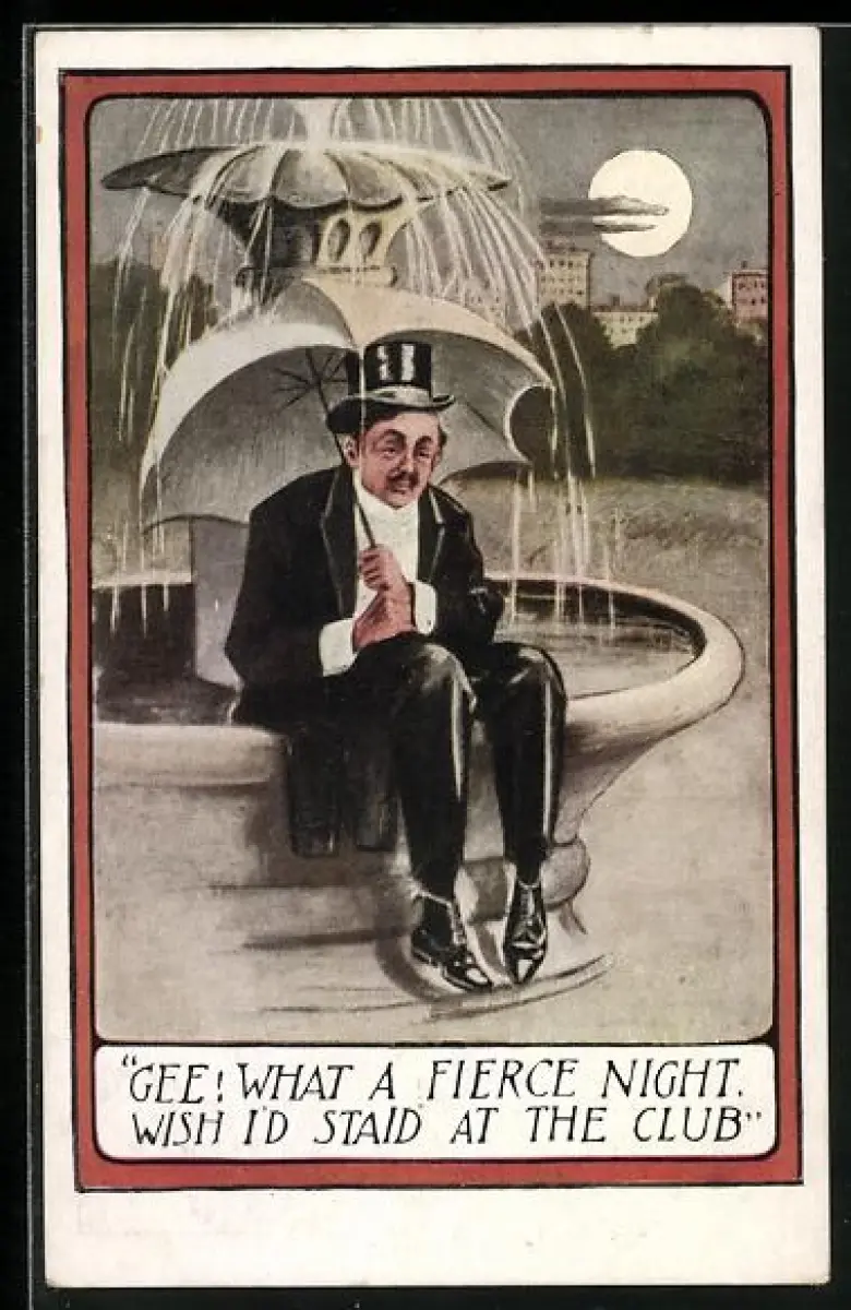 Künstler-AK Betrunkener Mann mit Regenschirm sitzt an einem Brunnen, Gee! What a fierce night...
