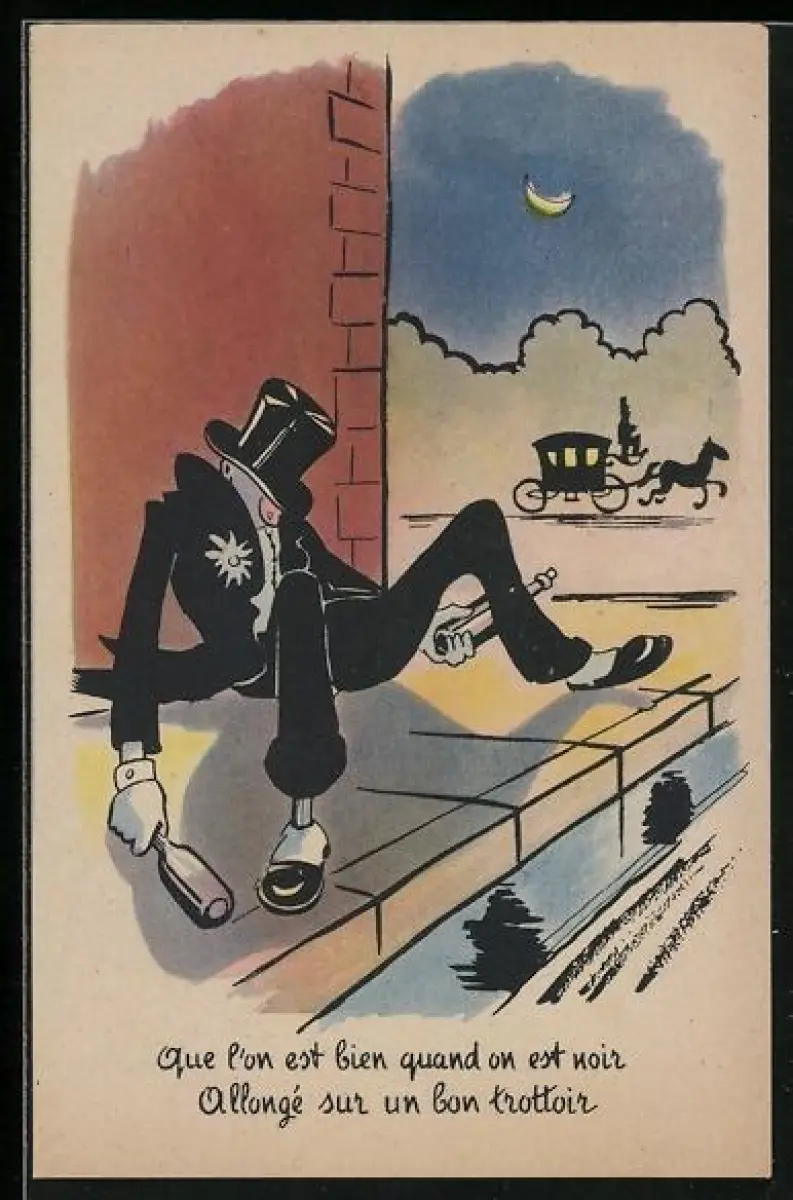 Künstler-AK Betrunkener Mann sitzt mit leeren Flaschen auf dem Boden, Que l`on est bien quand on est noir...