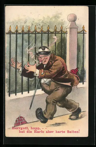 Künstler-AK Betrunkener Mann spielt auf einem Zaun und denkt es sei eine Harfe, Trinkerhumor