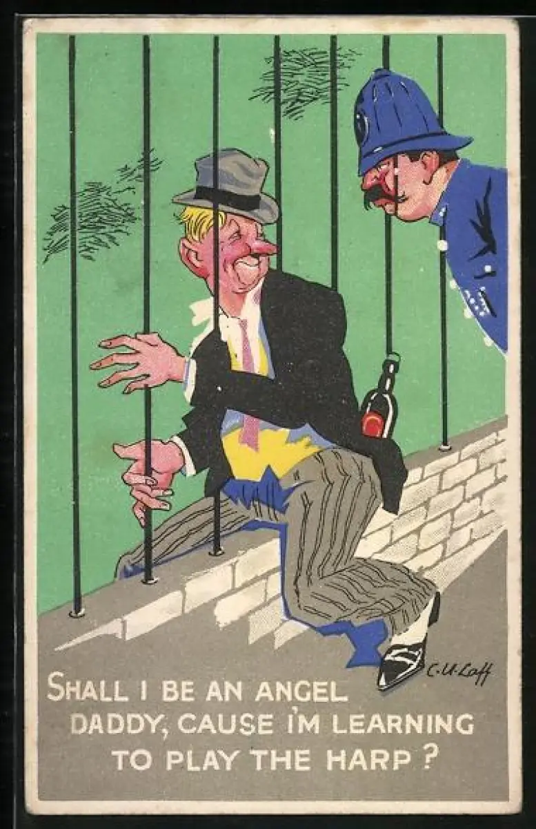 Künstler-AK Betrunkener Mann steckt in einem Zaun fest, Shall I be an angel daddy, cause I`m learning to play the harp