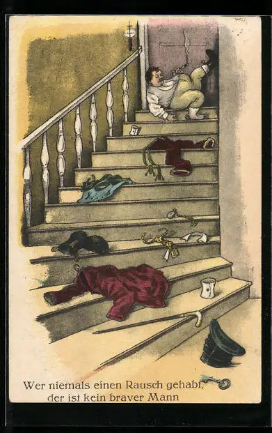 Künstler-AK Betrunkener halb entkleidet auf Treppen, Wer niemals einen Rausch gehabt, der ist kein braver Mann
