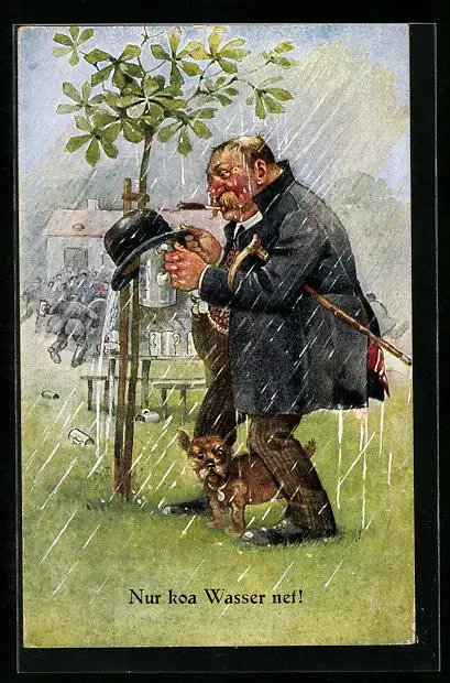 Künstler-AK Betrunkener schützt Bierkrug vor Regen Nur koa Wasser net, Trinkerhumor