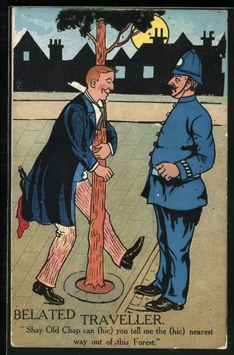Künstler-AK Betrunkener umarmt einen Baum, Belated Traveller, Sha Old Chap can (hic) you tell me the (hic)...