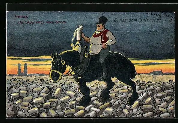 Künstler-AK Biertrinker auf schwarzem Pferd reitet über Bierhumpen