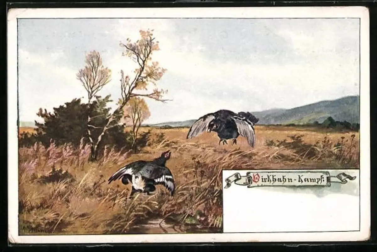 Künstler-AK Birkhahn-Kampf auf dem Feld