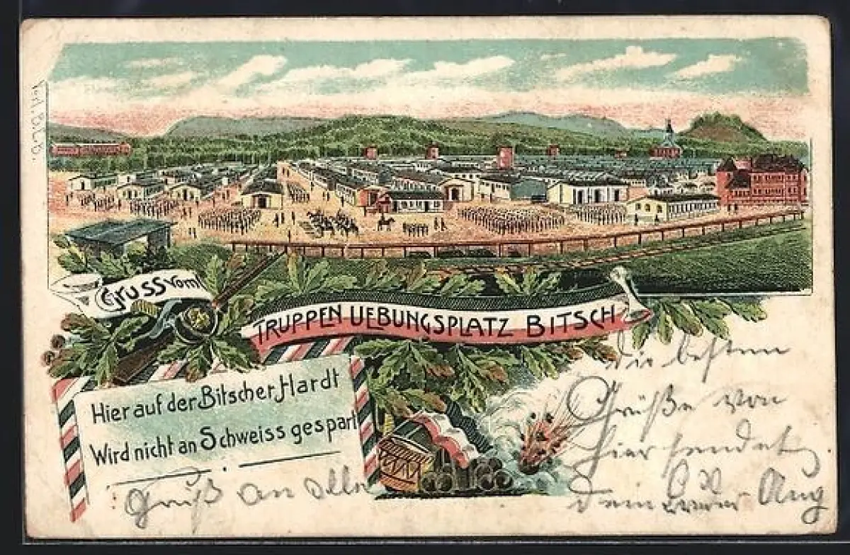 Künstler-AK Bitche, Blick auf den Truppenübungsplatz