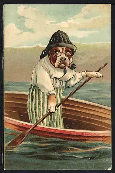 Künstler-AK Boxer im Ruderboot mit Pfeife und Südwester