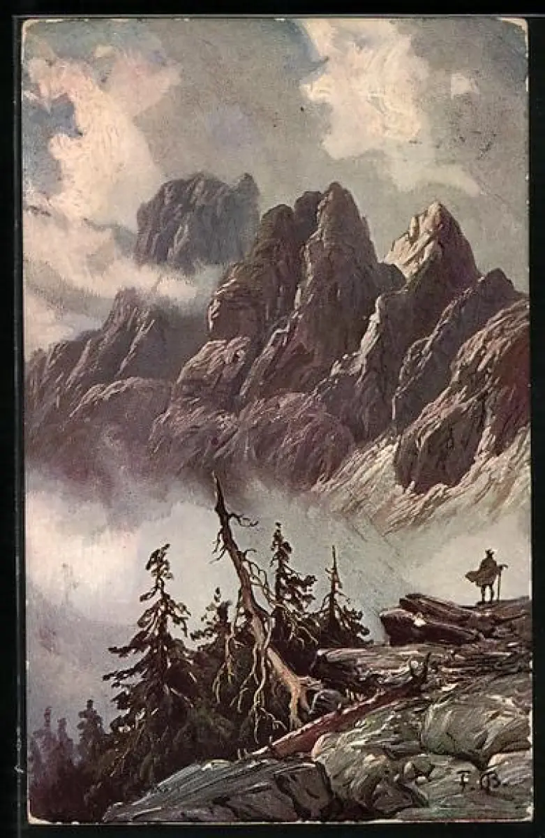 Künstler-AK Bozen, Rosengartenspitze mit Vajolettürme von Norden