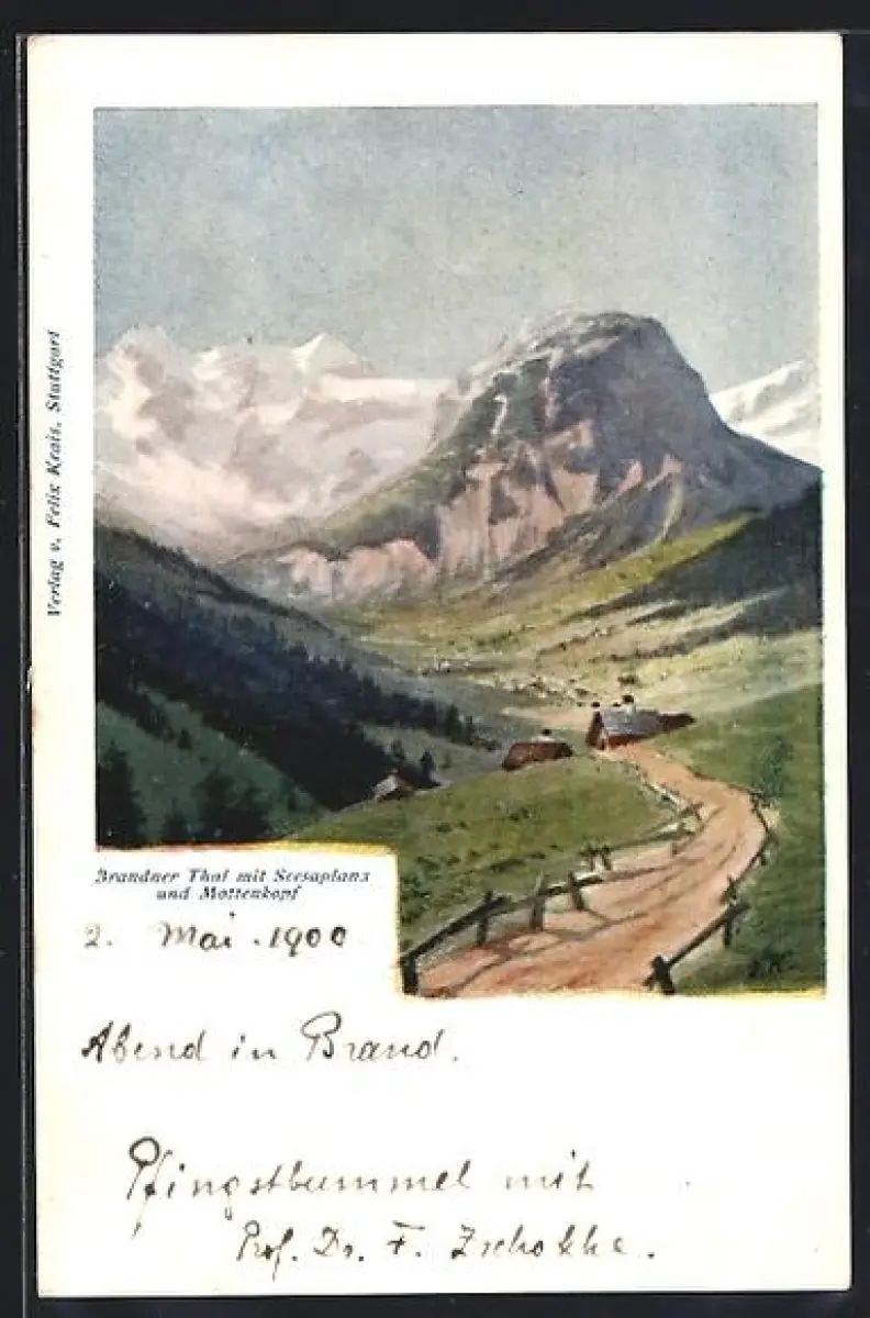 Künstler-AK Brand, Brandner Tal mit Scesaplana und Mottenkopf aus der Vogelschau