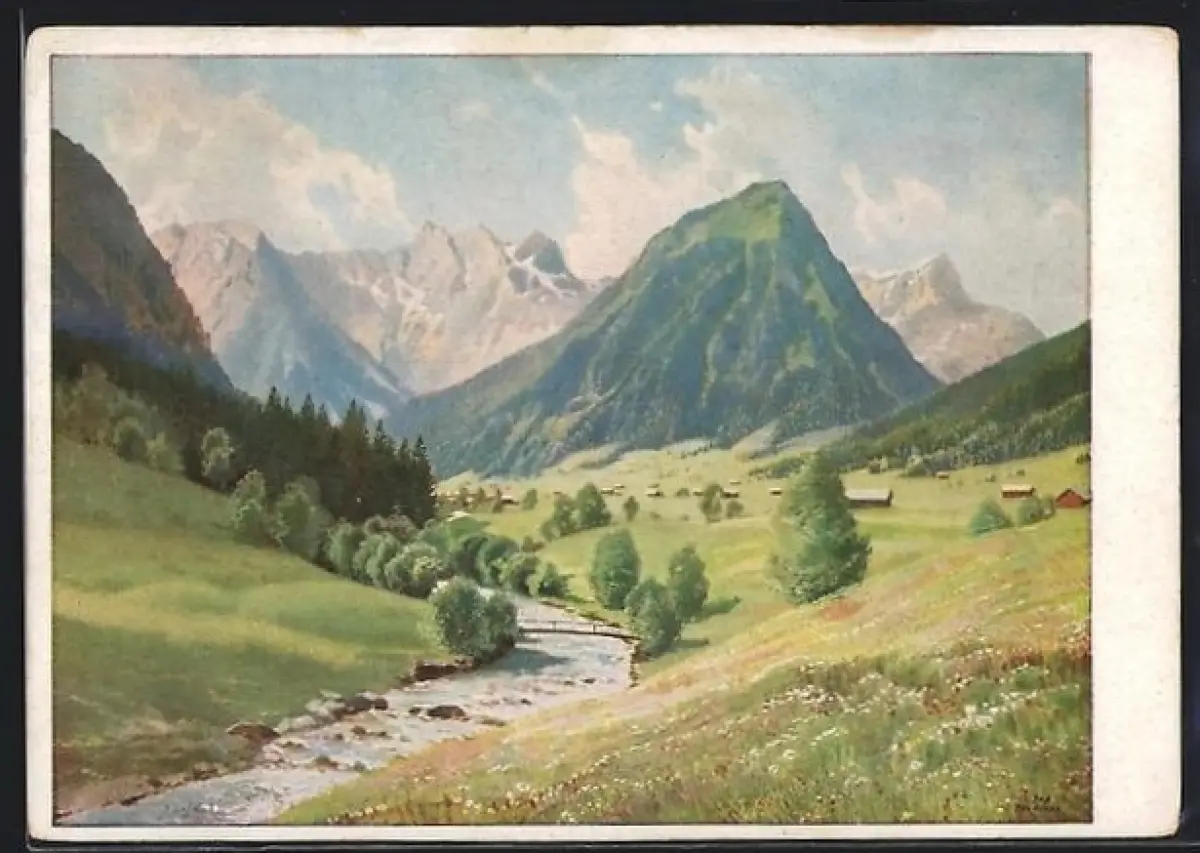 Künstler-AK Brand im Brandner Tal, Flusspartie mit Ortsansicht u. Scesaplana