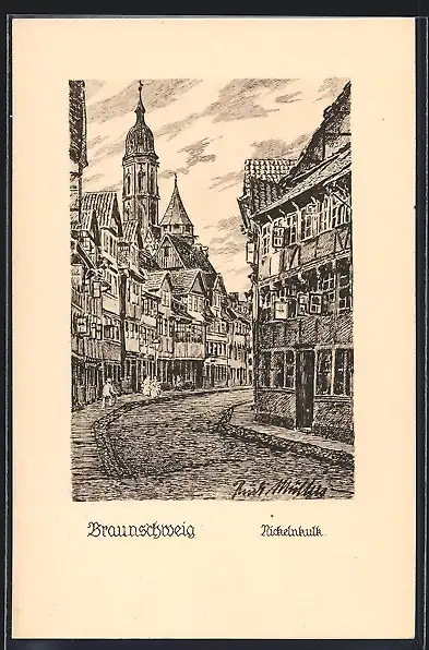 Künstler-AK Braunschweig, Nickelnkulk, Fachwerkhäuser