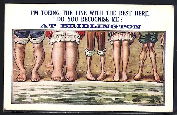Künstler-AK Bridlington, Tourists on the Beach, I`m toeing the line with the rest here