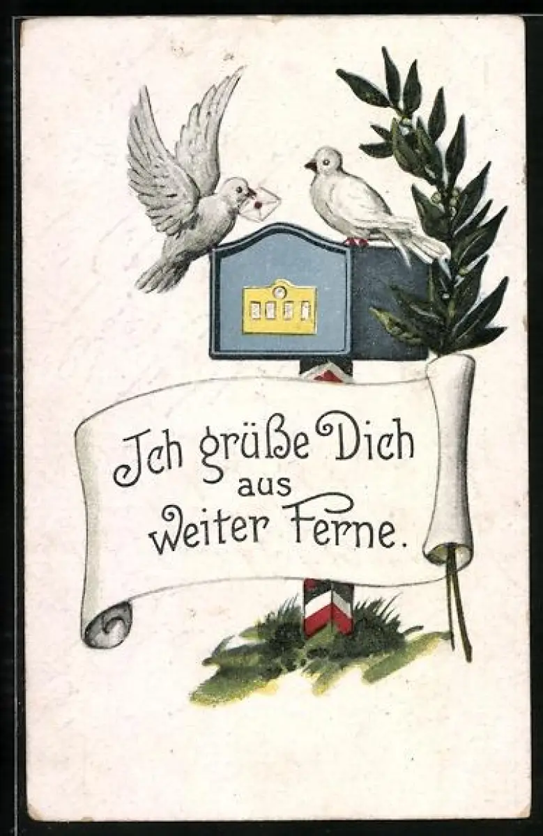 Künstler-AK Brieftauben sitzen mit einem Brief auf dem Briefkasten, Ich grüsse Dich aus weiter Ferne