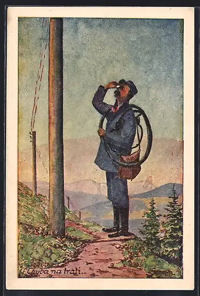 Künstler-AK Briefträger mit einem Kabel unter der Stromleitung