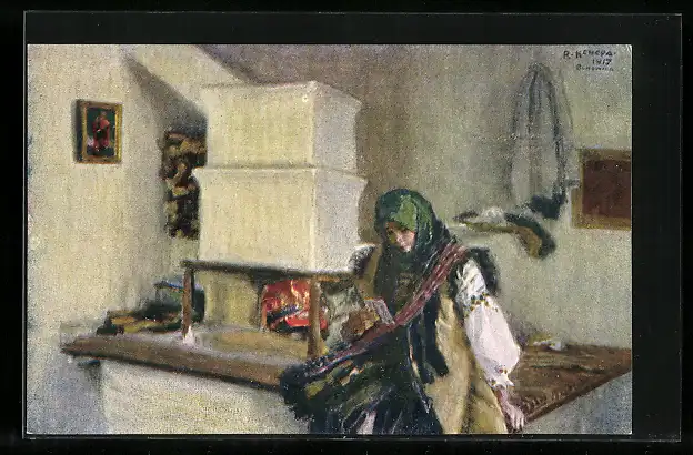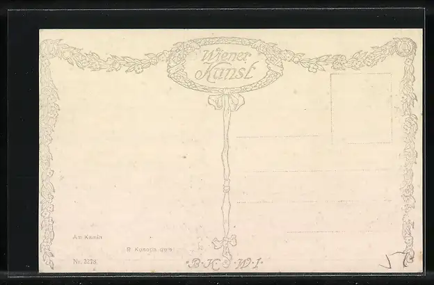 Künstler-AK Brüder Kohn (B.K.W.I) Nr. 2278: R. Konopa: Am Kamin, Mädchen in Winterkleidung wärmt sich auf