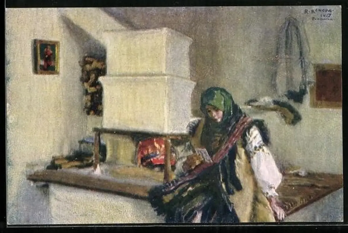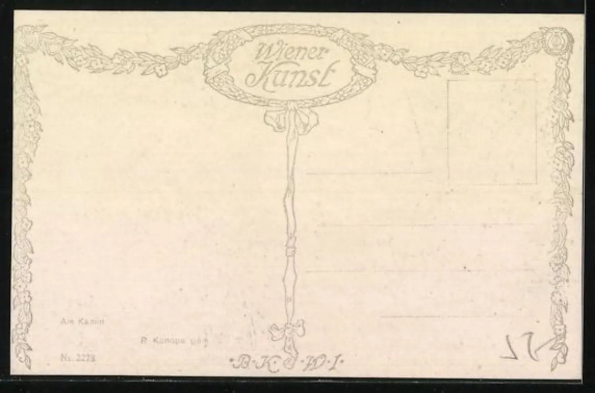 Künstler-AK Brüder Kohn (B.K.W.I) Nr. 2278: R. Konopa: Am Kamin, Mädchen in Winterkleidung wärmt sich auf