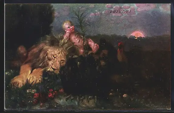 Künstler-AK Brüder Kohn (B.K.W.I) Nr. 3209: Löwe, Vögel und Kind schlafen auf einer Wiese, Friede