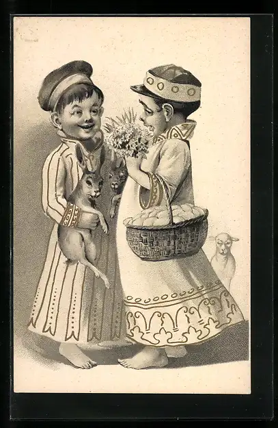 Künstler-AK Brüder Kohn (B.K.W.I) Nr. 4502-5: Zwei Kinder mit Osterhasen und Ostereiern