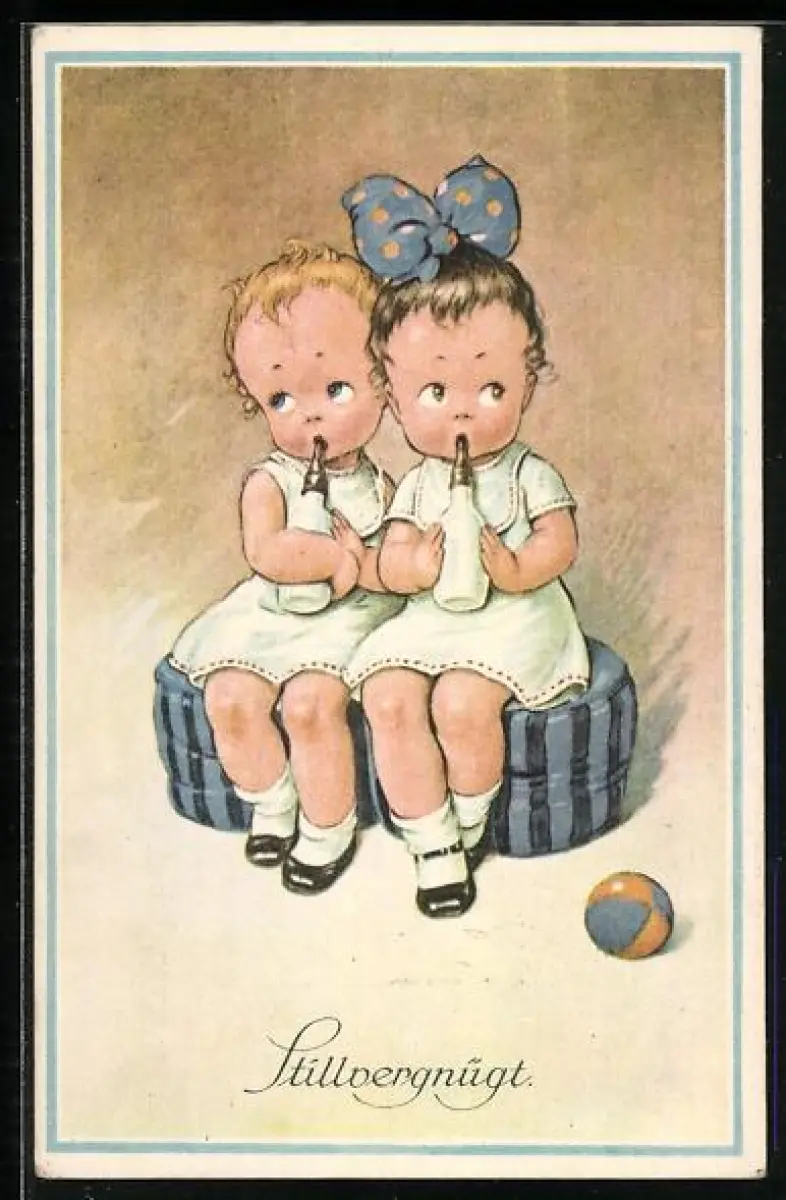 Künstler-AK Brüder Kohn (B.K.W.I) Nr. 548-3: Stillvergnügt, Kleines Paar mit Fläschchen