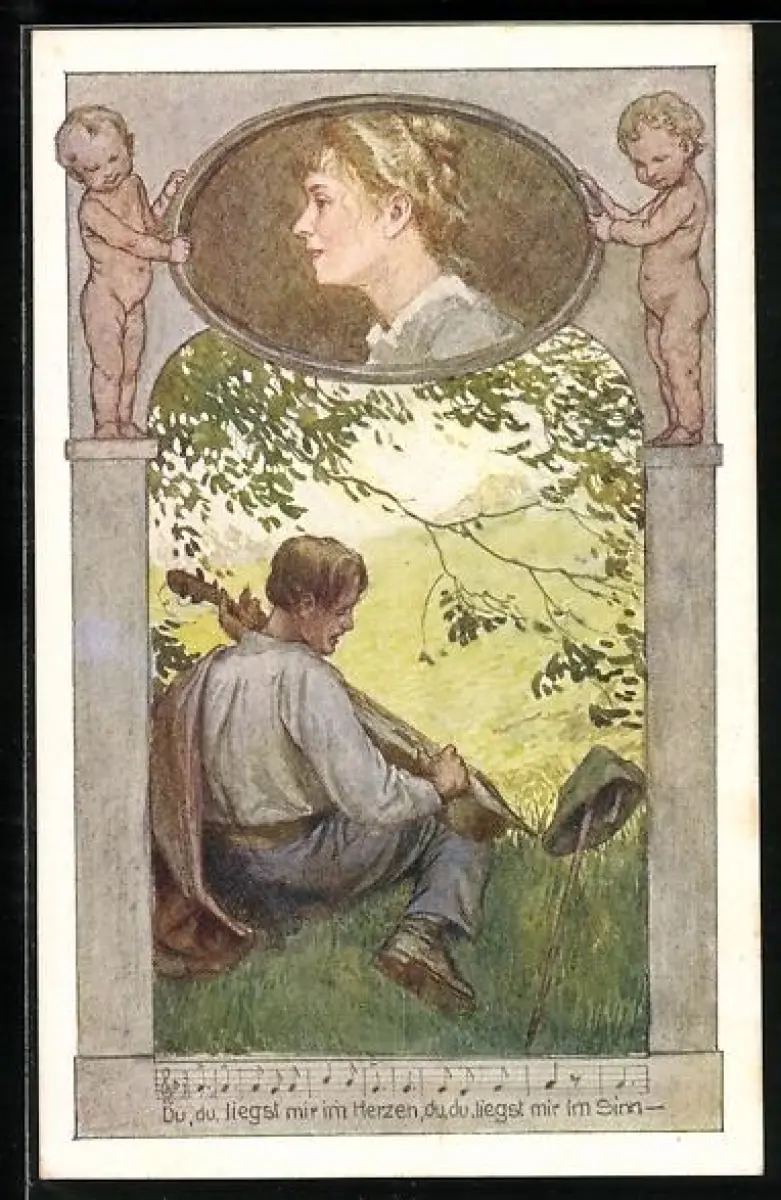 Künstler-AK Brüder Kohn (B.K.W.I) Nr.505-1: Junger Mann spielt auf seiner Gitarre ein Lied