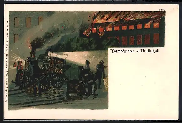 Künstler-AK Bruno Bürger & Ottillie Nr. 2072: Feuerwehr löscht brennendes Haus mit Dampfspritze