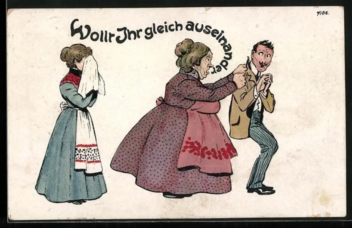 Künstler-AK Bruno Bürger & Ottillie Nr. 4186: Ältere Frau stellt sich zwischen ein Paar, Wollt ihr gleich auseinander