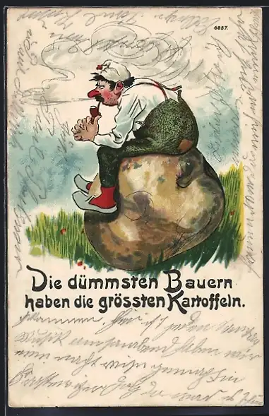 Künstler-AK Bruno Bürger & Ottillie Nr. 6887: Bauer sitzt auf einer riesigen Kartoffel