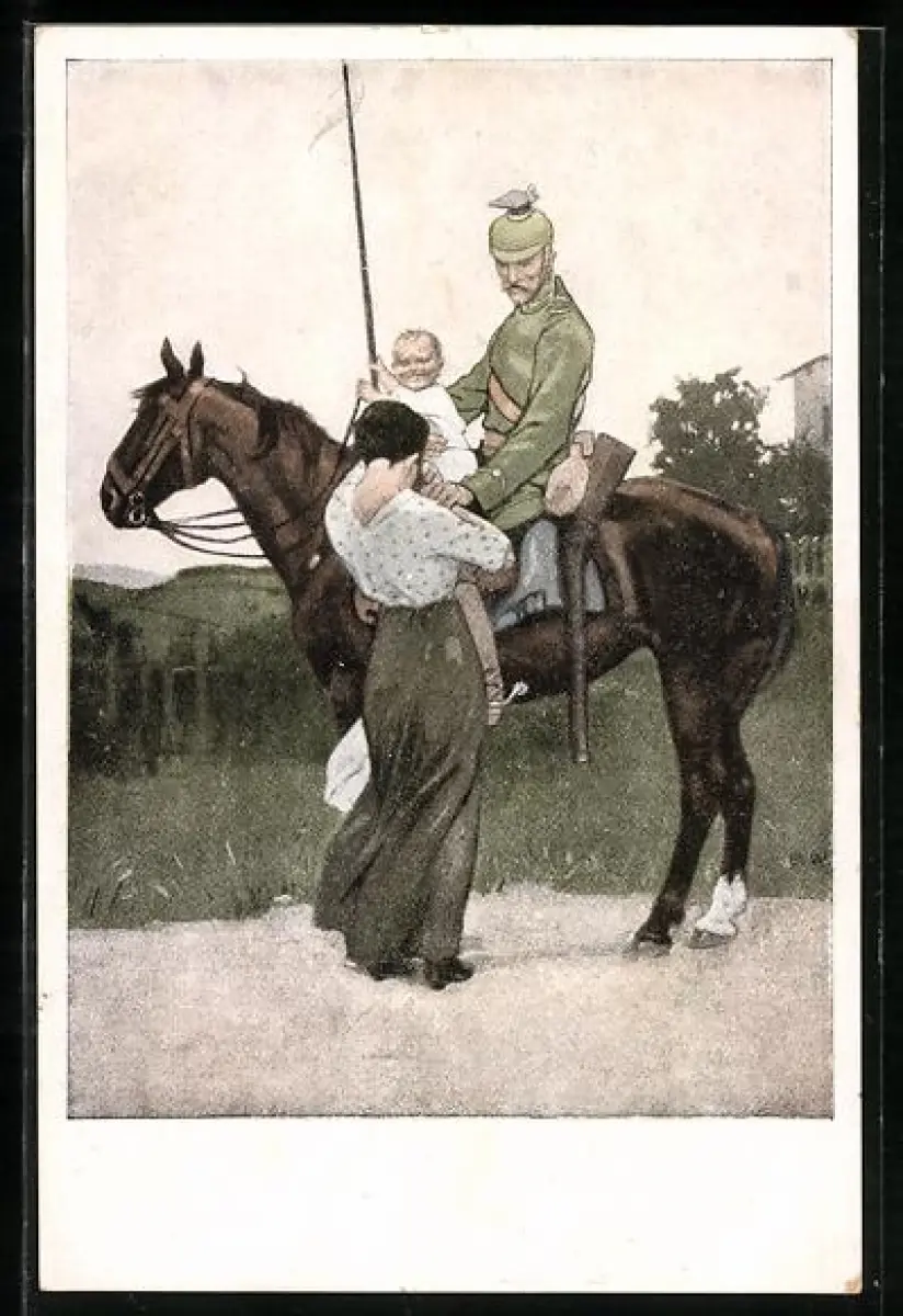 Künstler-AK Brynolf Wennerberg: Abschied, weinende Frau & lachender Sohn mit dem Vater zu Pferde