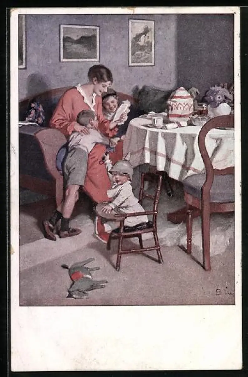Künstler-AK Brynolf Wennerberg: Gute Nachrichten von der Front, Frau liest Kindern Feldpost vor