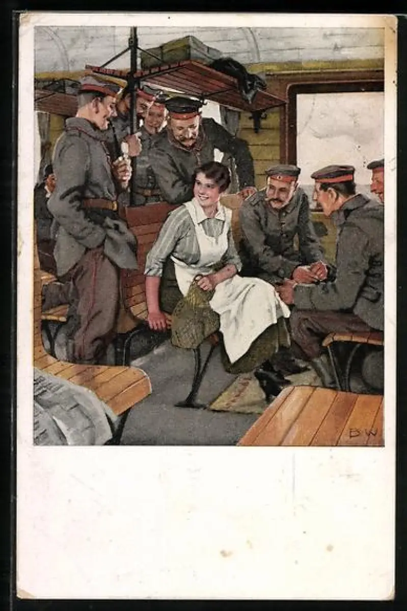 Künstler-AK Brynolf Wennerberg: Urlaubsfahrt, Soldaten mit hübscher Dienstmagd im Zugabteil