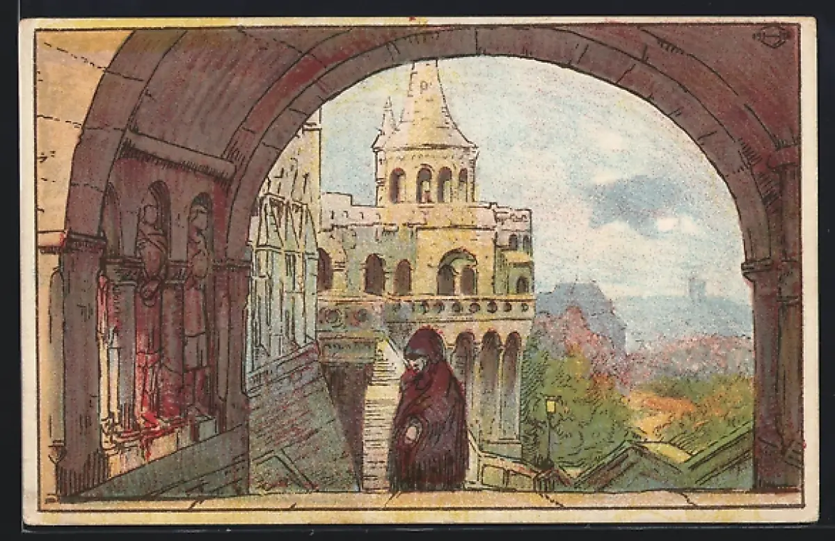 Künstler-AK Budapest, Resztelek a Halasz-bastyarol Keszültek az Kir. Iparmüveszeti Iskolaban