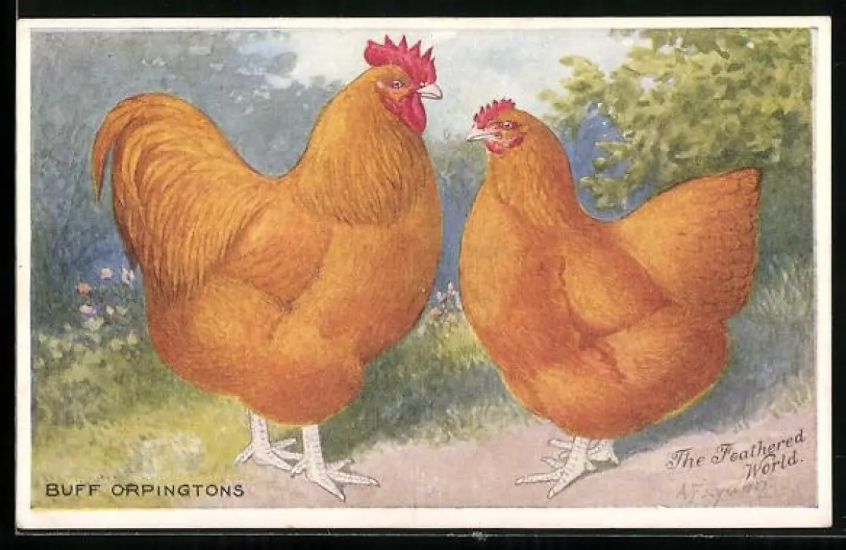 Künstler-AK Buff Orpingtons, Hahn und Henne, The Feathered World