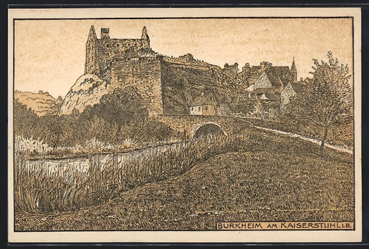 Künstler-AK Burkheim am Kaiserstuhl, Ortspartie mit Ruine