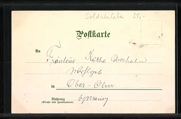 Personenbezogene Daten auf der Rückseite der Karte wurden durch blauen Textmarker unkenntlich gemacht. Die blauen Stellen sind auf die Vorderseite durchgeweicht und wirken sich negativ auf das Postkartenfoto aus