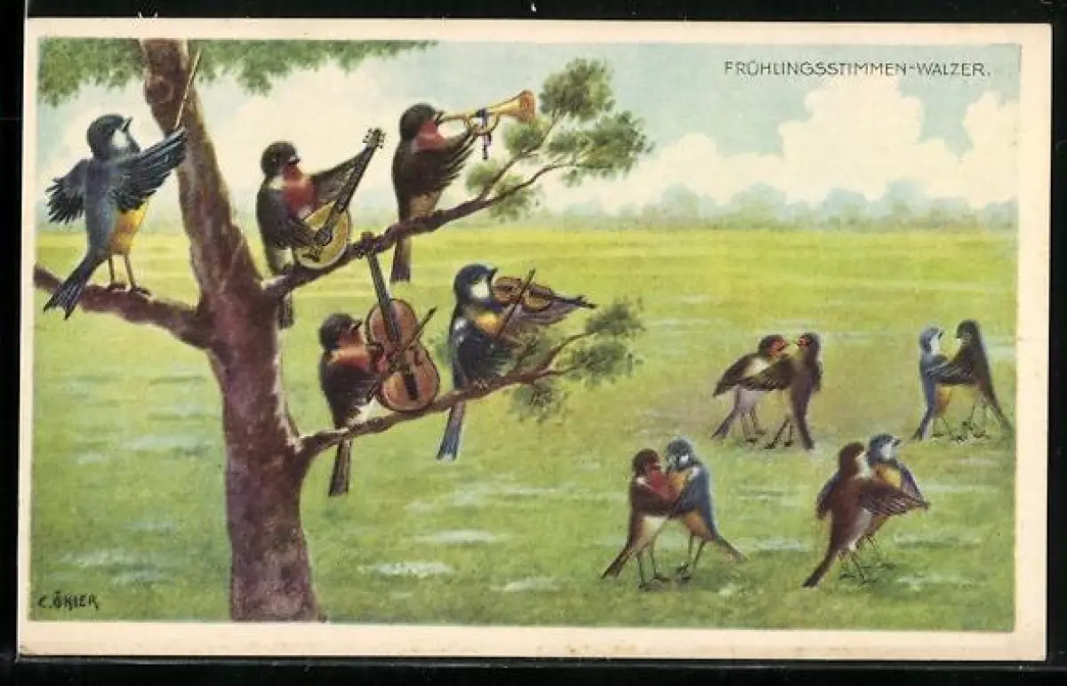 Künstler-AK C. Öhler: Frühlingstimmen-Walzer, vermenschlichte Vögel musizieren und tanzen