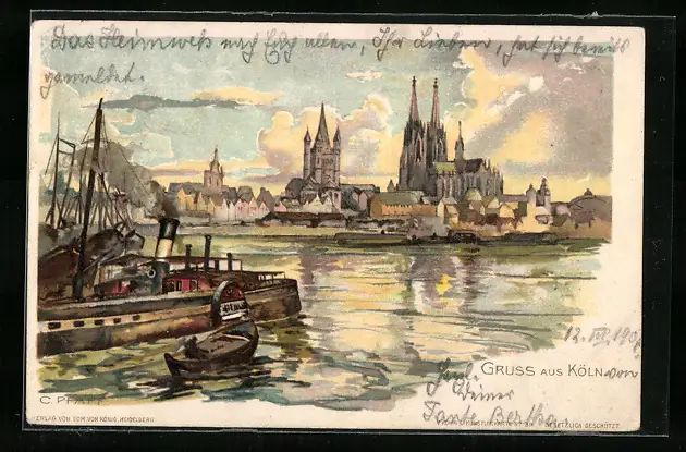 Künstler-AK C. Pfaff: Köln, Teilansicht mit Dom, Rheindampfer