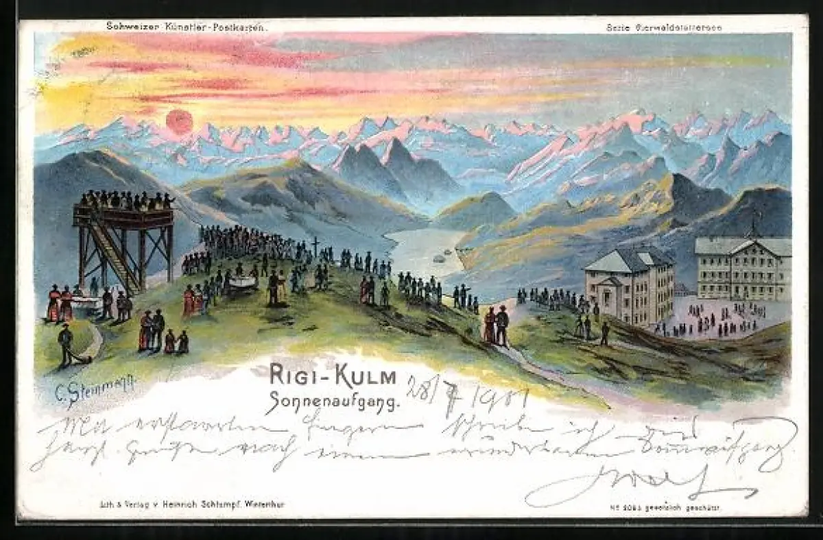 Künstler-AK C. Steinmann: Rigi-Kulm, Sonnenaufgang mit Besuchern auf dem Aussichtspunkt