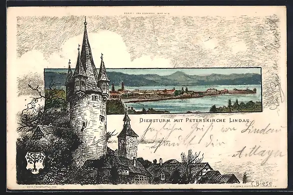 Künstler-AK C.Biese: Lindau, Diebsturm mit der Peterskirche, Gesamtansicht mit Bodensee
