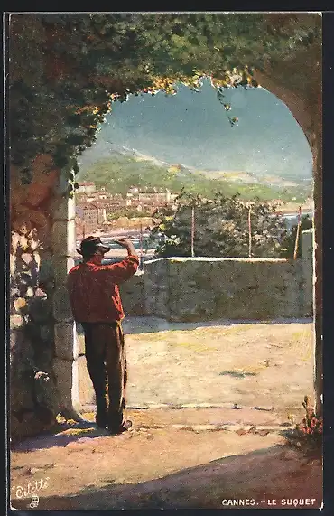 Künstler-AK Cannes, Le Suquet, vue d`un homme admirant le paysage sous une arche