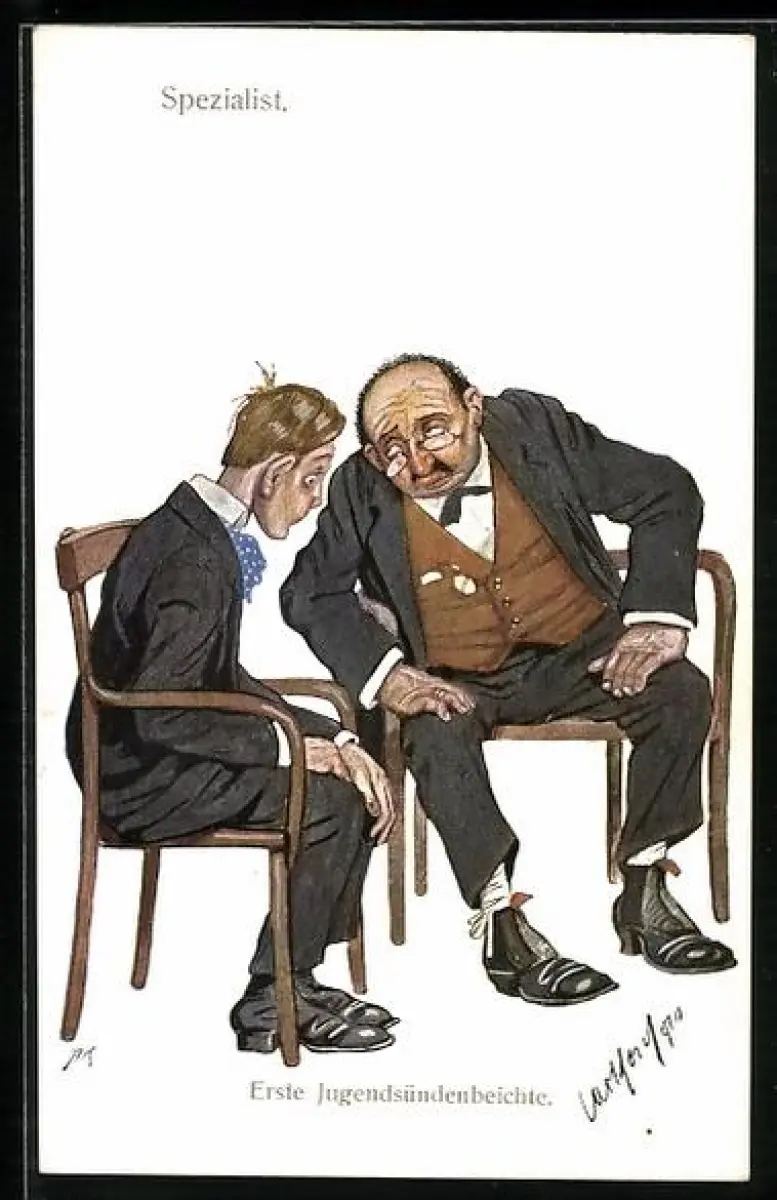 Künstler-AK Carl Josef: Junger Mann beichtet älteren Herrn eine Jugendsünde
