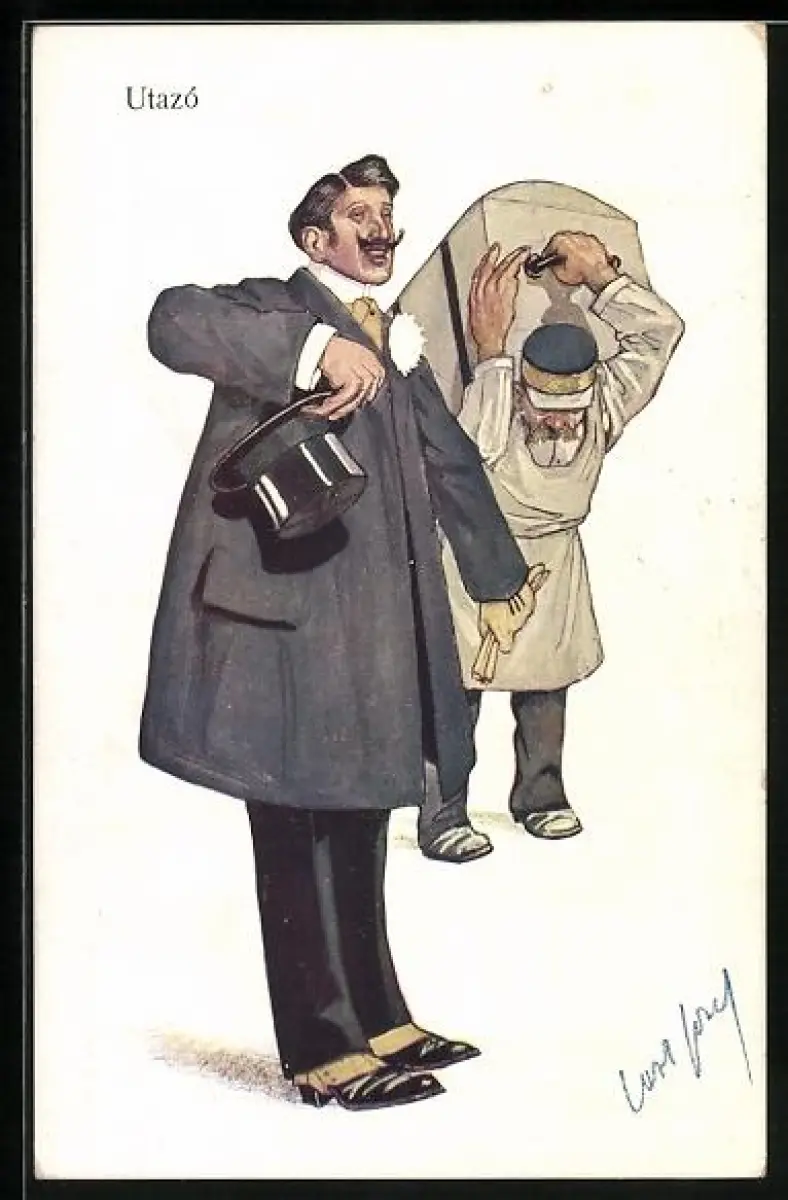 Künstler-AK Carl Josef Pollak: Utazo, Mann im mantel und alter Mann trägt den Koffer