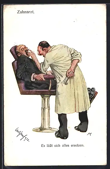 Künstler-AK Carl Josef Pollak: Zahnarzt bei der Behandlung eines Patienten