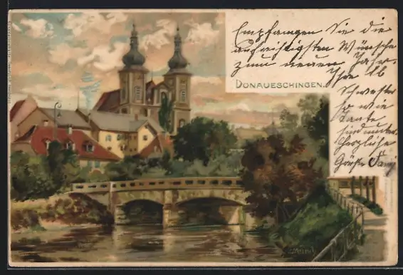 Künstler-AK Carl Münch: Donaueschingen, Schützenbrücke mit Kirche