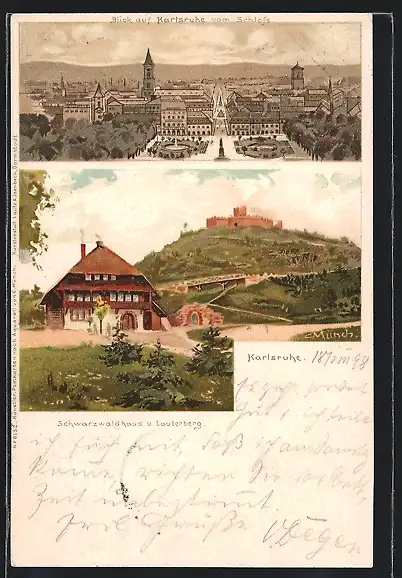 Künstler-AK Carl Münch: Karlsruhe, Blick vom Schloss auf die Stadt, Schwarzwaldhaus und Lauterberg