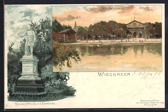 Künstler-AK Carl Münch: Wiesbaden, Kurhaus mit Weiher, Denkmal Kaiser Wilhelm I.