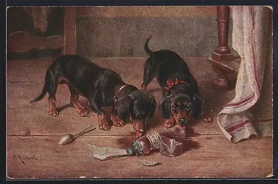 Künstler-AK Carl Reichert: Dackel mit zerbrochener Syrupflasche