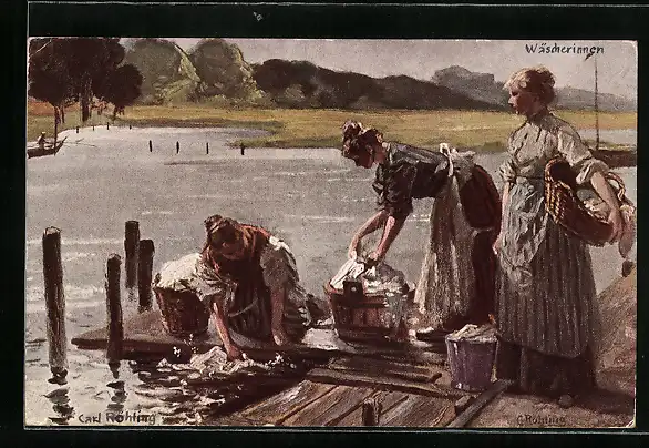 Künstler-AK Carl Röhling: Wäscherinnen, Waschfrauen bei der Arbeit am Steg